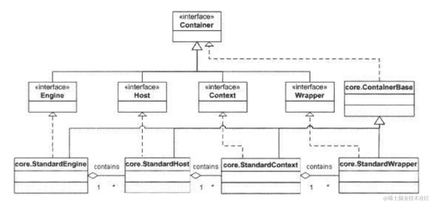 Engine是顶层容器,java程序能够运行是因为有引擎即jvm,很自然的,Engine正是可以配置jvm(jvmRoute="jvm1")。Host是Engine的子容器,Context是Host的子容器,Wrapper是Context的子容器,这4个接口的标准实现分别是StandardEngine、StandardHost、StandardContext、StandardWrapper,她们都在org.apache.catalina.core包类,分析tomcat容器正式主要分析这4个类。下图展示了Container接口及其子接口和实现类的UML类图。