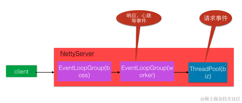 execution:(ExecutionDispatcher类)只把请求类消息派发到业务线程池处理,但是响应和其它连接断开事件,心跳等消息直接在IO线程上执行,模型如下图: