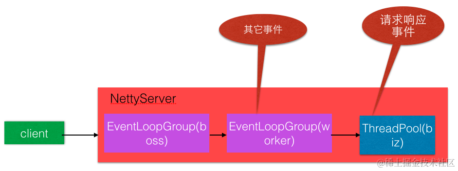 message : (MessageOnlyDispatcher类)只有请求响应消息派发到业务线程池,其他连接断开事件/心跳等消息,直接在IO线程上执行,模型图如下: