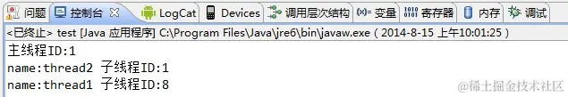 | 1234567891011121314151617181920212223 | public class Test {`` public static void main(String[] args) {`` System.out.println( "主线程ID:" +Thread.currentThread().getId());`` MyThread thread1 = new MyThread( "thread1" );`` thread1.start();`` MyThread thread2 = new MyThread( "thread2" );`` thread2.run();`` }``} class MyThread extends Thread{`` private String name;`` public MyThread(String name){`` this .name = name;`` }`` @Override`` public void run() {`` System.out.println( "name:" +name+ " 子线程ID:" +Thread.currentThread().getId());`` }``} |
