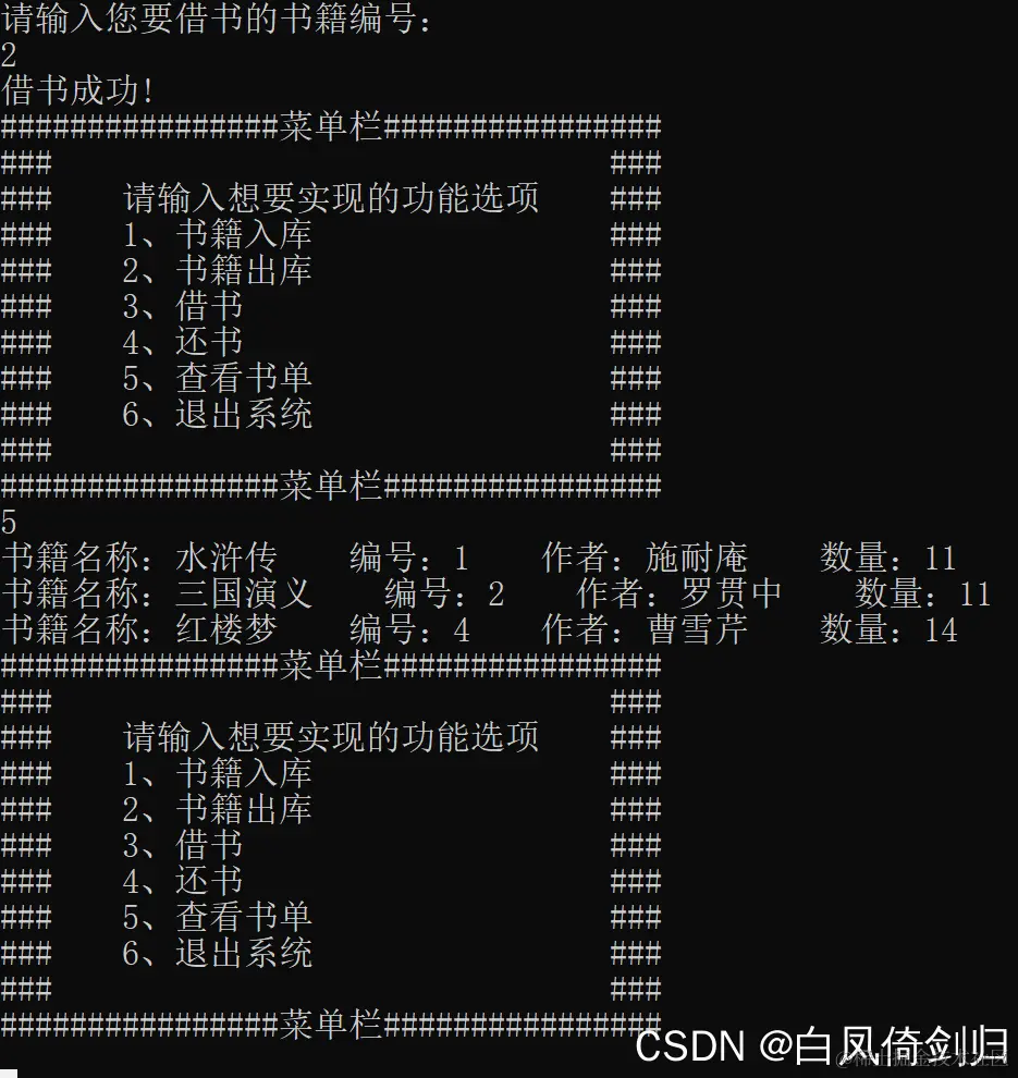 //要求:使用结构体完成图书馆出库、入库、借书、还书功能