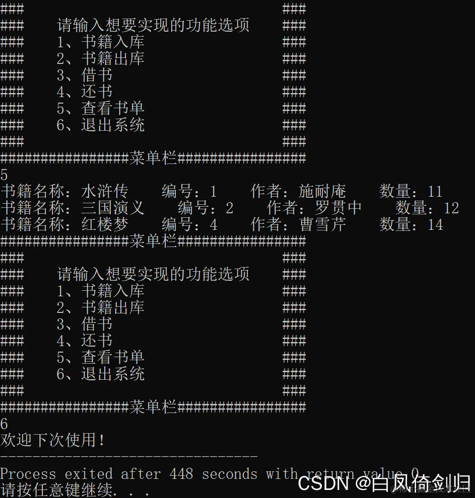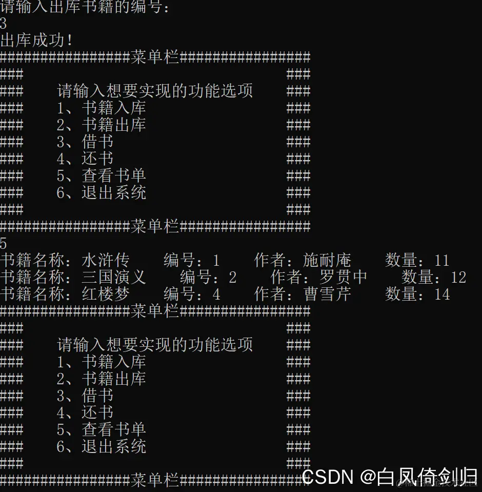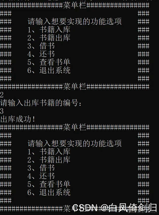 printf("### 2、书籍出库 ###\n");