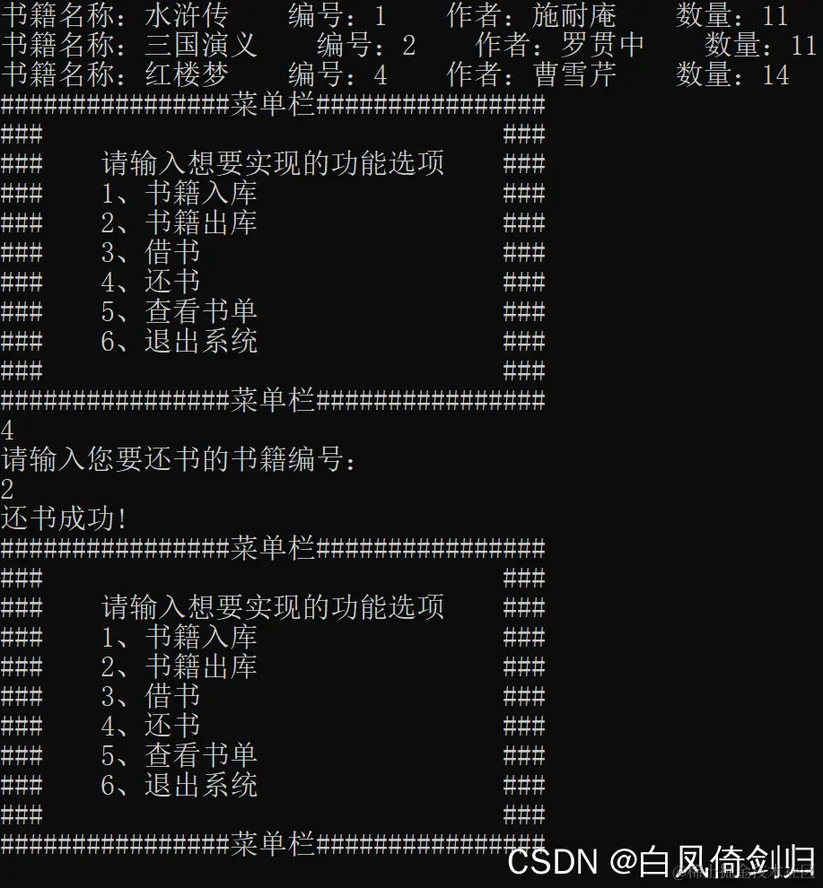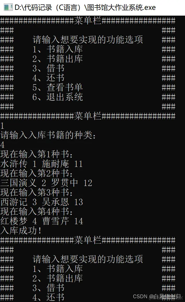 本系统实现了书籍的入库出库借书以及还书的系统