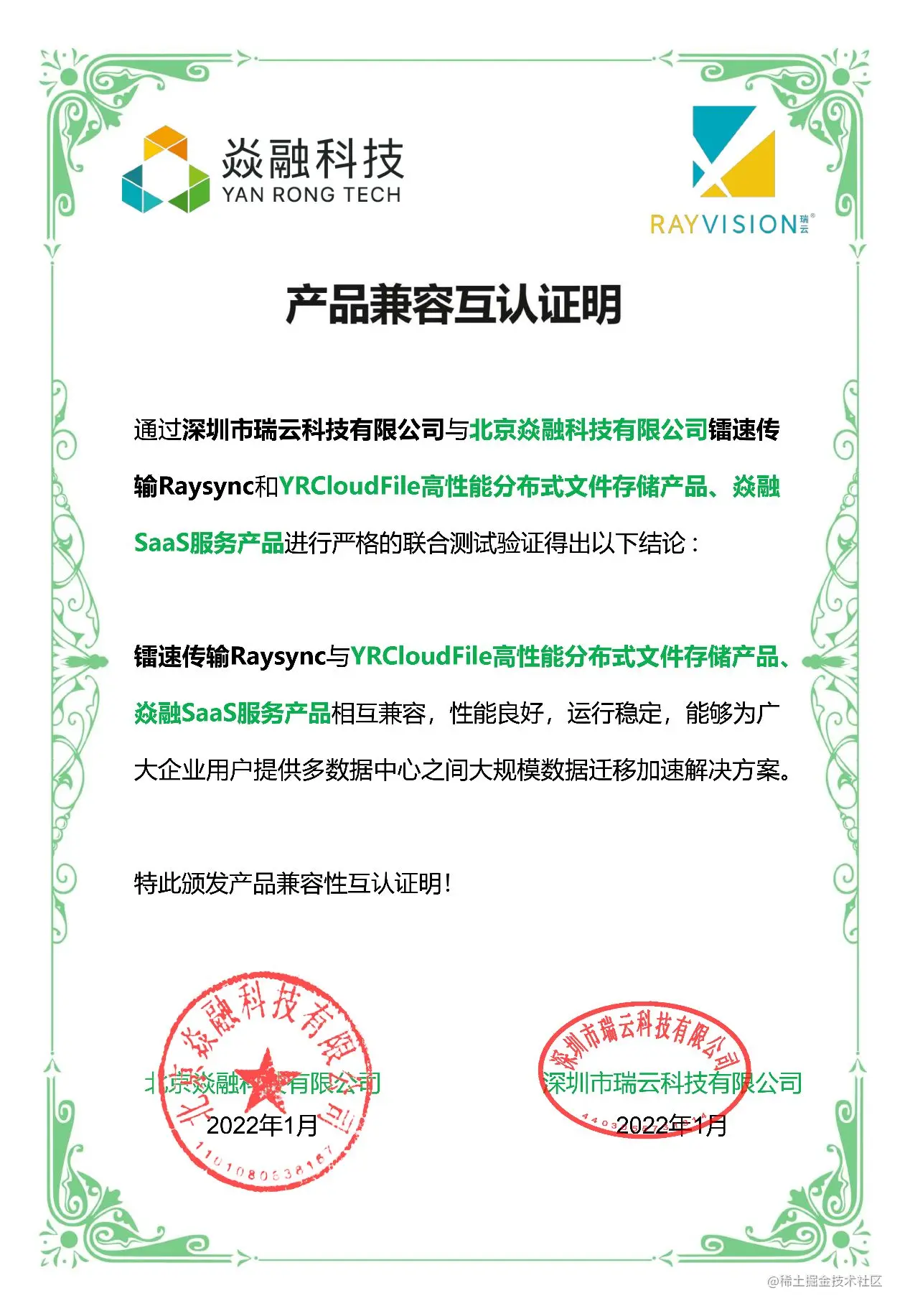 目前,加快构建完善的信息技术应用创新产业生态圈,推动信息技术领域软硬件产品的国产化进程逐渐成为行业共识。近日,北京焱融科技有限公司(以下简称:焱融科技) YRCloudFile 高性能分布式文件存储产品、焱融 SaaS 平台与深圳市瑞云科技有限公司(以下简称:瑞云科技)镭速传输 Raysync 完成产品兼容性认证。经双方严格测试表明:焱融科技 YRCloudFile、焱融 SaaS 平台与瑞云镭速传输 Raysync 在兼容性、可靠性和完全性等方面表现良好,且运行稳定。
