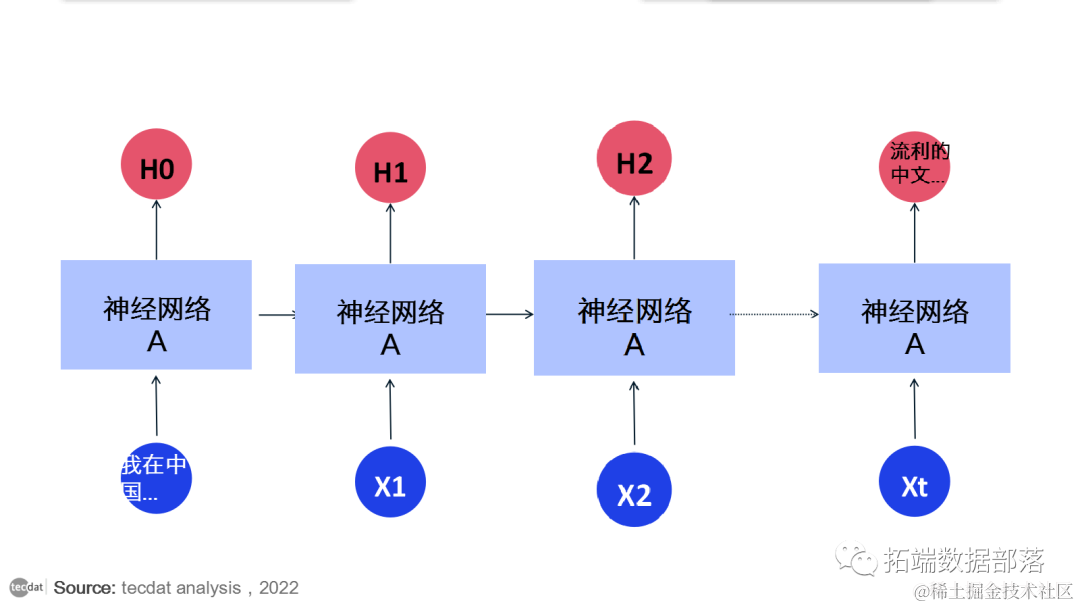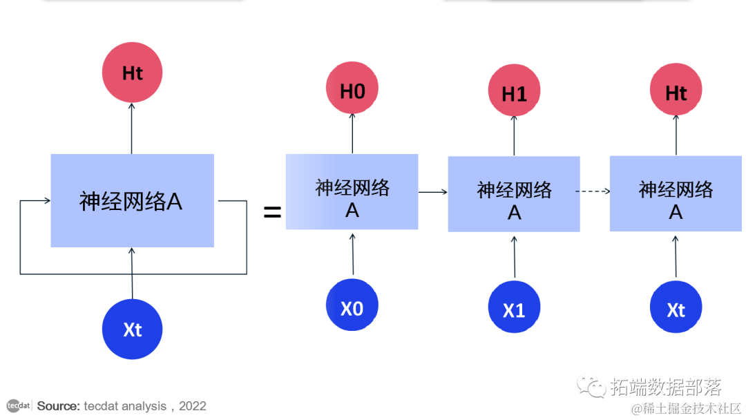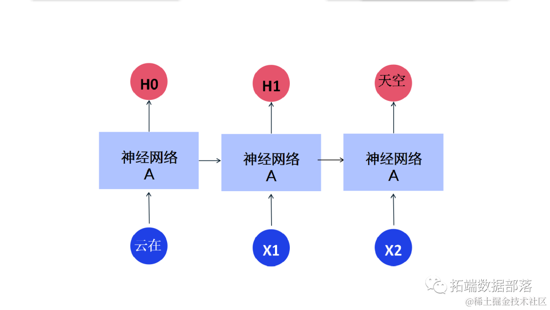 在上图中,一大块神经网络,查看一些输入x并输出一个值h. 循环允许信息从网络的一个步骤传递到下一个步骤。
