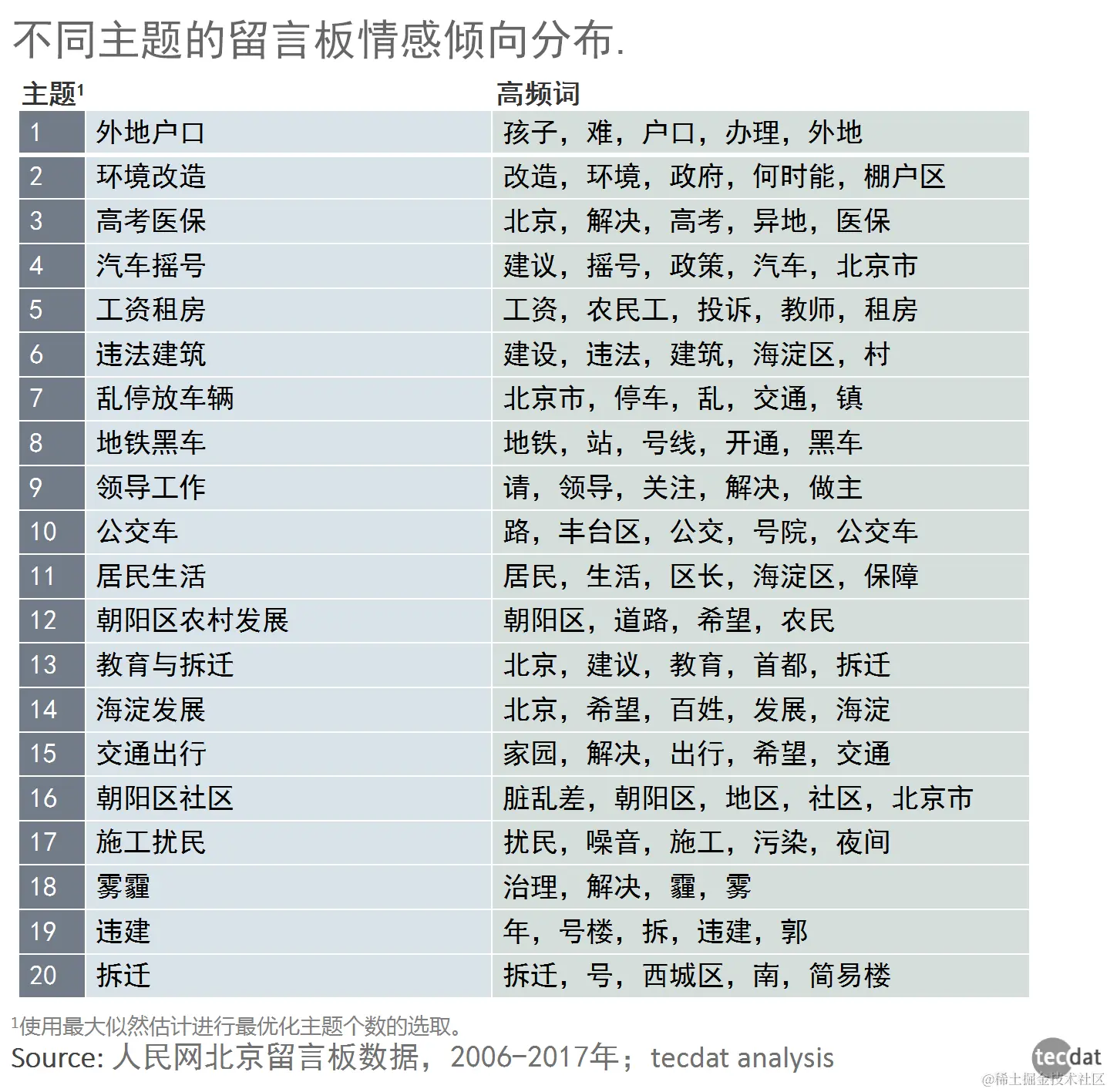 我们使用最大似然估计进行最优化主题个数的选取。当主题个数定为20的时候,似然估计数最大,即留言板数据分为20个主题的可能性比较大。将模型生成的20个主题中的前五个高频词取出,如下表所示。
