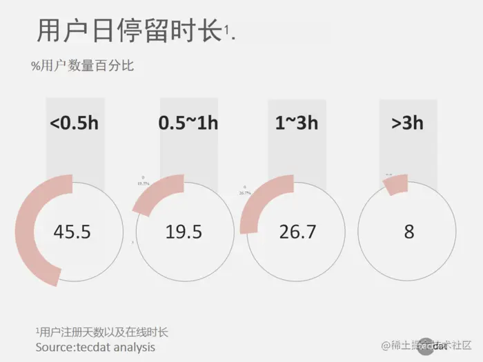 通过计算用户注册天数和在线持续时间,可以发现虽然45.5%的用户每天使用不到半小时,但超过30%的用户花费超过一小时超过一小时,表明由洗发水社区提供的内容更具吸引力。