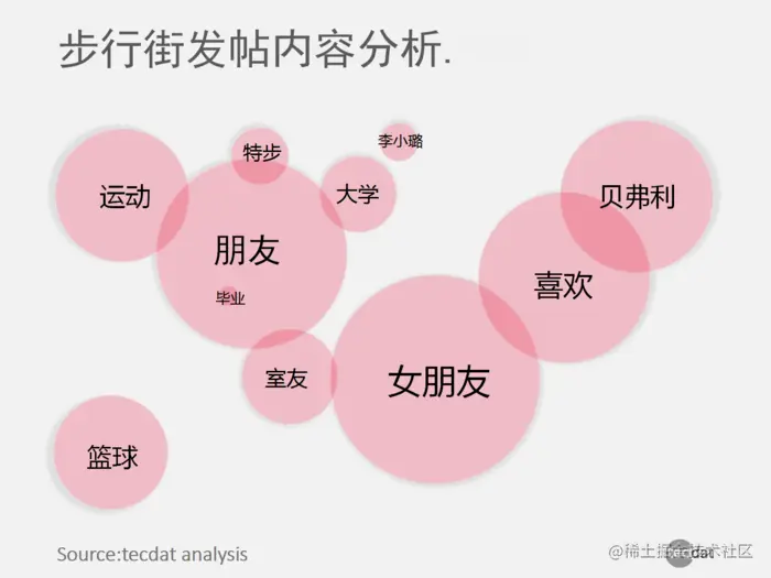 通过文字云分析所有步行街的帖子内容,删除上面提到的高频词50,可以得到以下词云图。从单词云图中可以看出,步行街区的讨论内容经常被提及情感关键词,如“女朋友”,“朋友”和“喜欢”,可以推断成员Tiger Puff社区主要是年轻人;