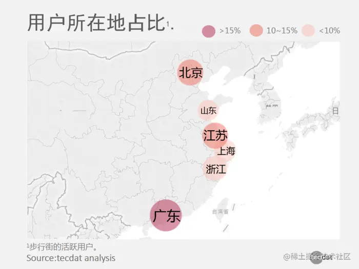 从下面的地理分布可以看出,步行街的活跃用户主要分布在经济发达的省市,如广东,江苏,北京,浙江和上海,上述五个地区占50%以上。总;