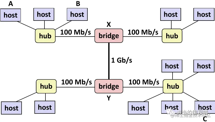 桥接以太网段是通常范围是一层楼,通过不同的 bridge 来连接不同的 ethernet segment。Bridge 知道从某端口出发可达的主机,并有选择的在端口间复制数据。