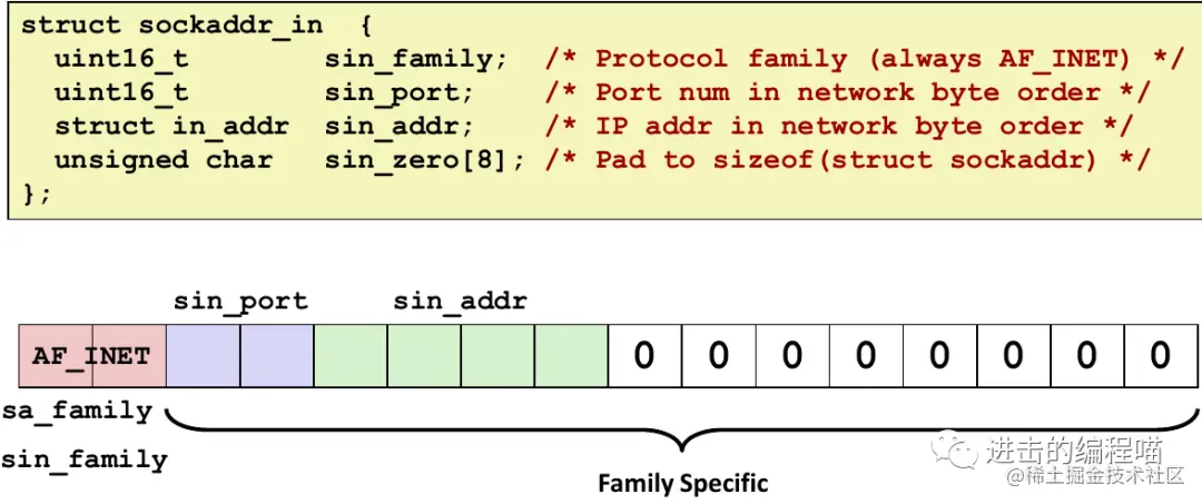 特定套接字(IPv4)地址,对于接受套接字地址参数的函数,必须将(struct sockaddr_in *)(注意:_in是internet的缩写,而不是input的缩写) 转成(struct sockaddr *)作为函数参数