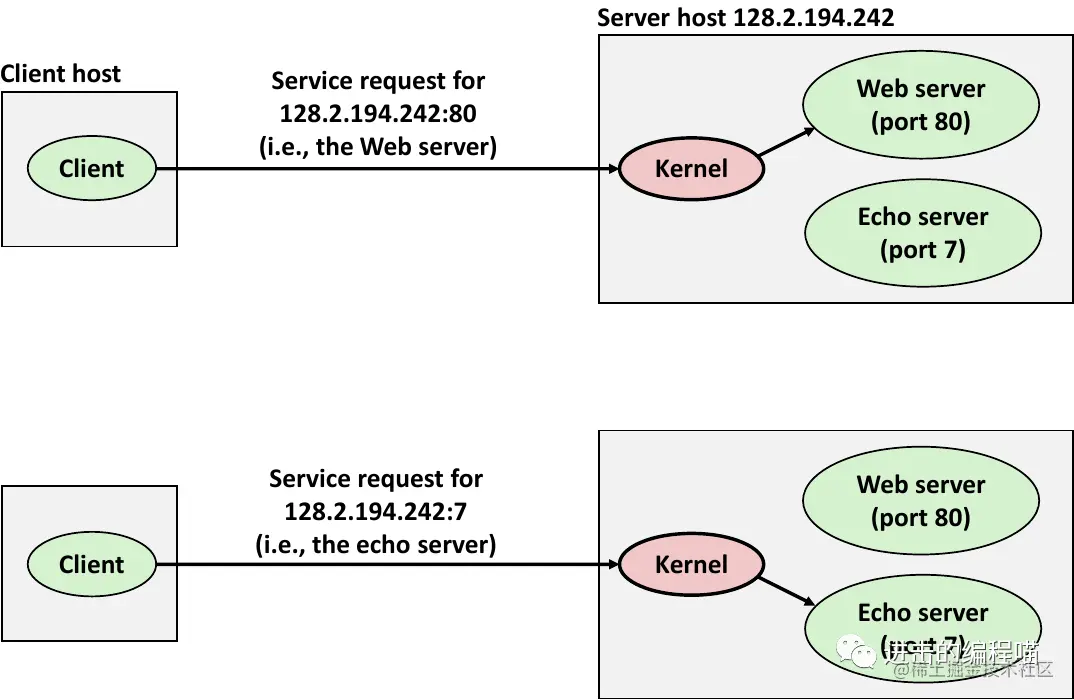 一系列系统级的函数,和Unix I/O 配合构造网络应用。对于 kernel 来说,socket 是 endpoint of communication;对于应用程序来说,socket 是用来读写的文件描述符。客户端和服务器通过读写对应套接字描述符进行通信。普通文件I/O和套接字I/O主要区别是程序如何“打开”套接字描述符
