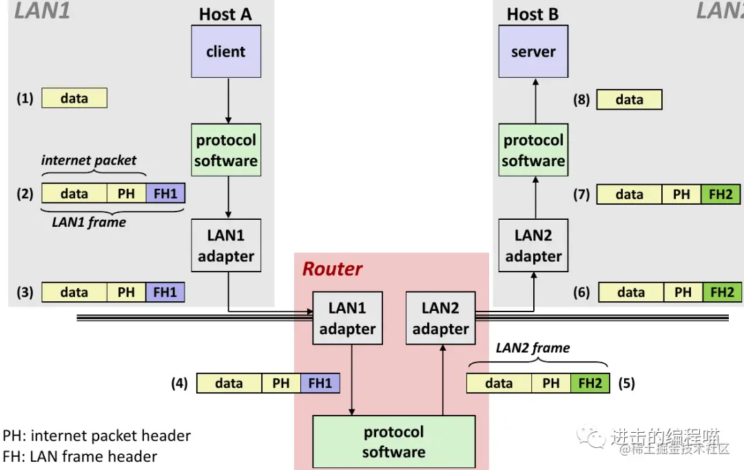 具体的数据传输如下图所示,这里 PH = Internet packet header, FH = LAN frame header