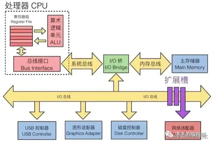 客户端进程发送请求给服务器进程,服务器进程获取所需资源并响应客户端进程的请求,客户端进程收到响应后展示给用户。对主机而言,网络只是一种I/O设备,是数据源和数据接收方,网络相关的处理,都是通过网络适配器来完成的,具体在硬件上为(右下角):