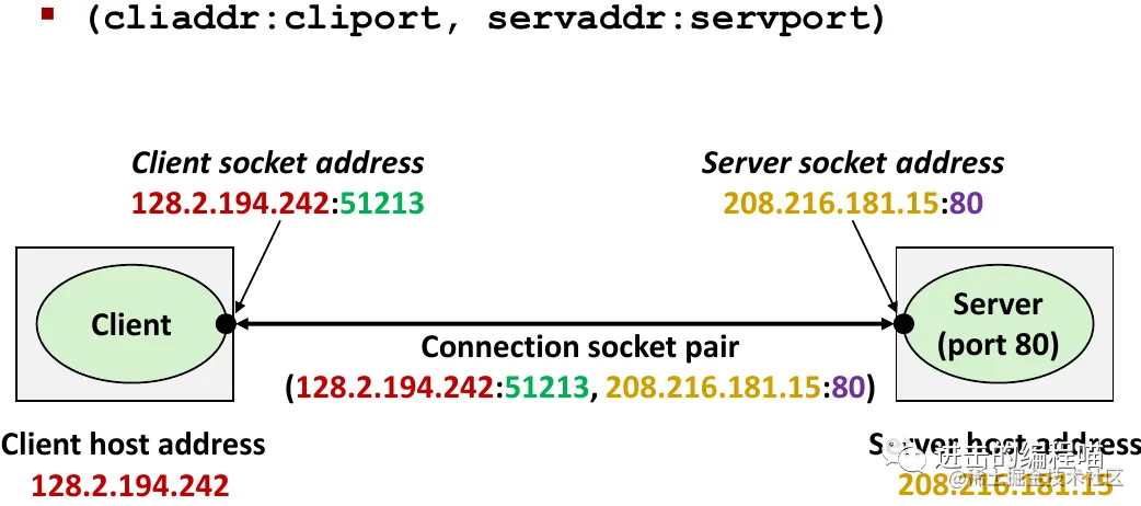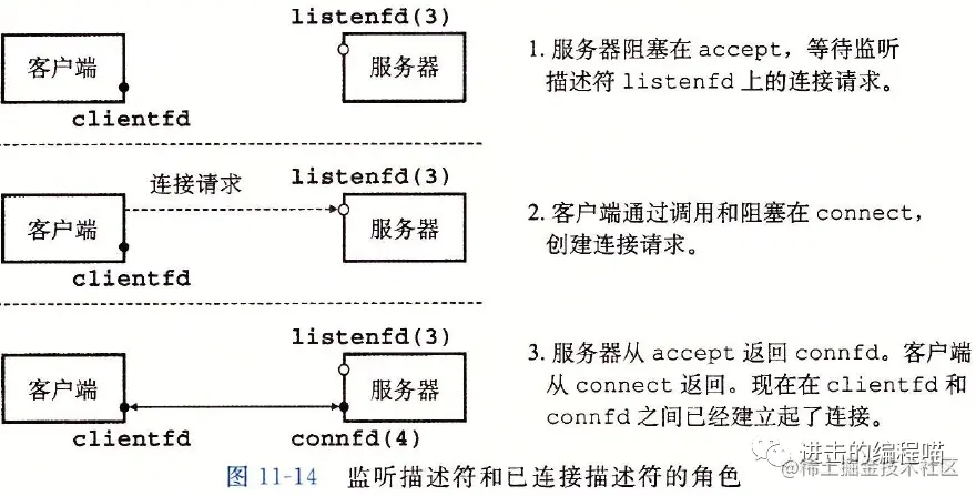 客户端和服务器通过使用套接字接口建立连接。一个套接字是连接的一个端点,连接以文件描述符的形式提供给应用程序。使用套接字接口进行通信