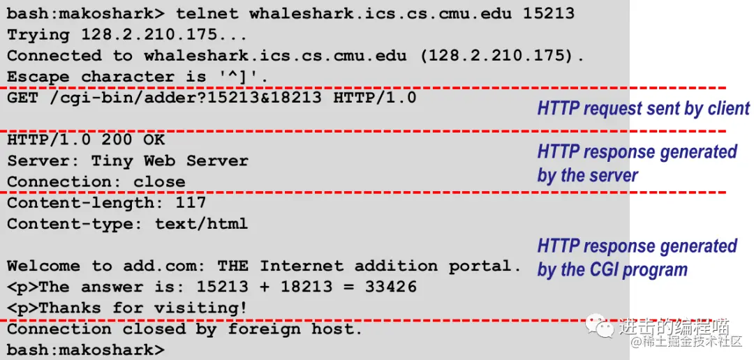 在发送响应后,派生一个新的子进程。子进程用来自请求URI的CGI参数初始化QUERY_STRING 环境变量。注意,一个真正的服务器还会在此处设置其他的 CGI 环境变量。接着子进程重定向它的标准输出到已连接文件描述符,然后加载并运行CGI程序。因为CGI程序运行在子进程的上下文中,它能够访问所有在调用 execve 函数之前就存在的打开文件和环境变量。因此,CGI程序写到标准输出上的任何东西都将直接送到客户端进程,不会受到任何来自父进程的干涉。其间,父进程阻塞在对wait 的调用中,等待当子进程终止的时候,回收操作系统分配给子进程的资源
