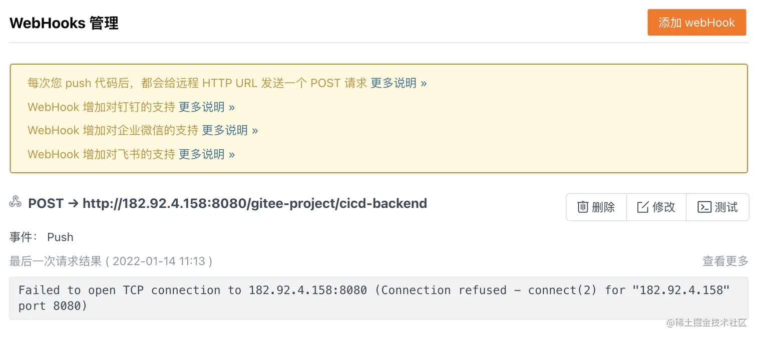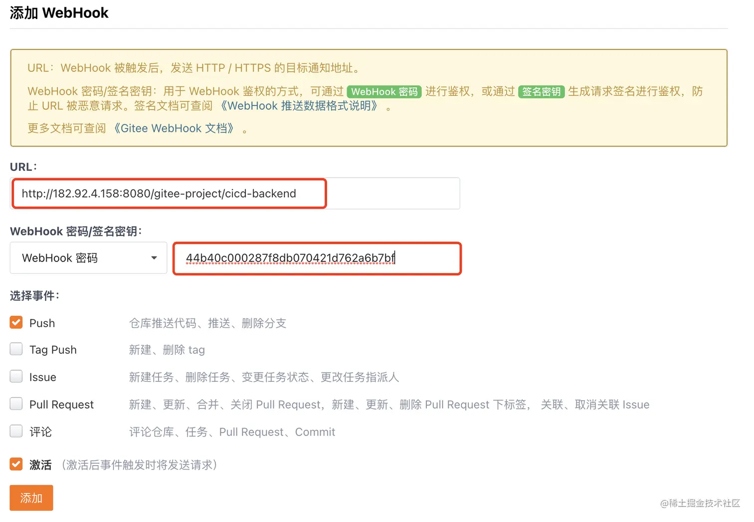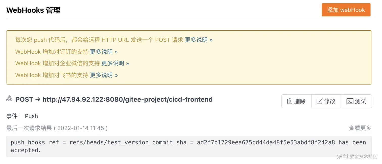添加 WebHook:填写前面生成的 url 和秘钥,点击添加即可