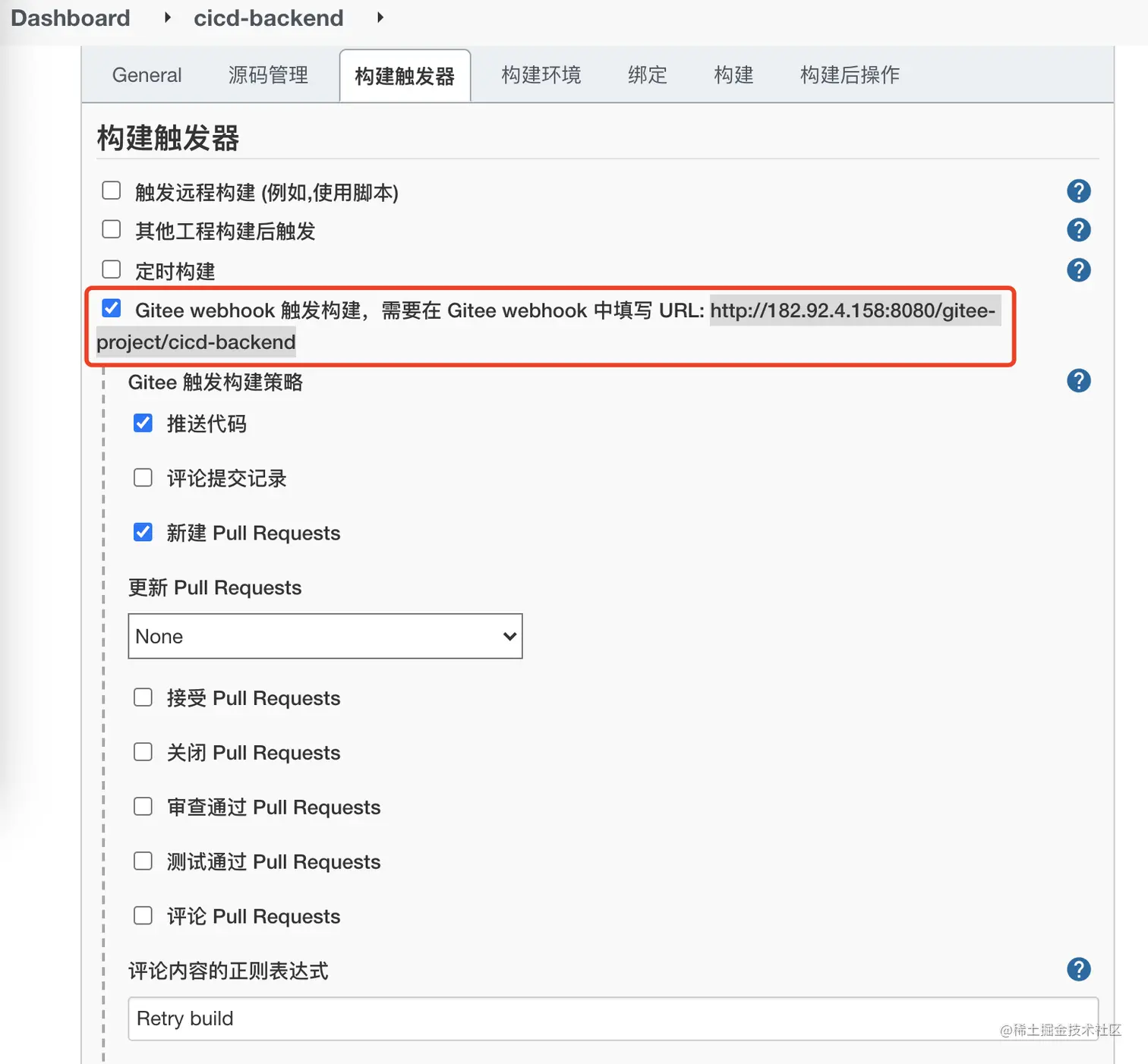 - Gitee webhook 触发构建,并记录 webhook URL 地址