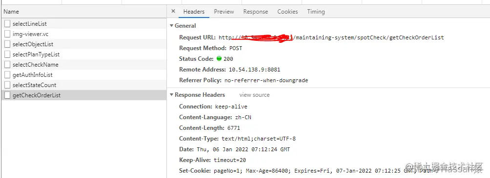 这是一个接口,http请求,打码部分是ip地址+端口号,第二部分是项目名称,第三部分就是我前面在controller里写的mapping“spotCheck”+"getCheckOrderList",当然如果只用一个注解,就可以直接写成“SpotCheck-getCheckOrderList”效果是一样的。以上,这个DispatcherServlet分发器,就成功地找到了我们后台的controller。