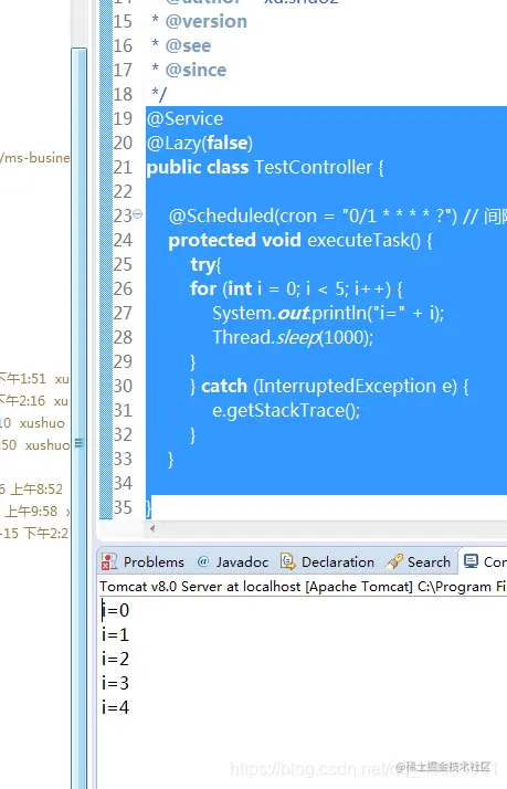 但是,定时器并不是要等tomcat完全start up之后才执行,而是在启动过程中扫描到注解就已经开始了,也就是说我整个项目还没起来,但是这个定时器就开始跑了。这就是我加时间的作用,我要看到在启动过程中,什么时候打印了几条。以下是结果: