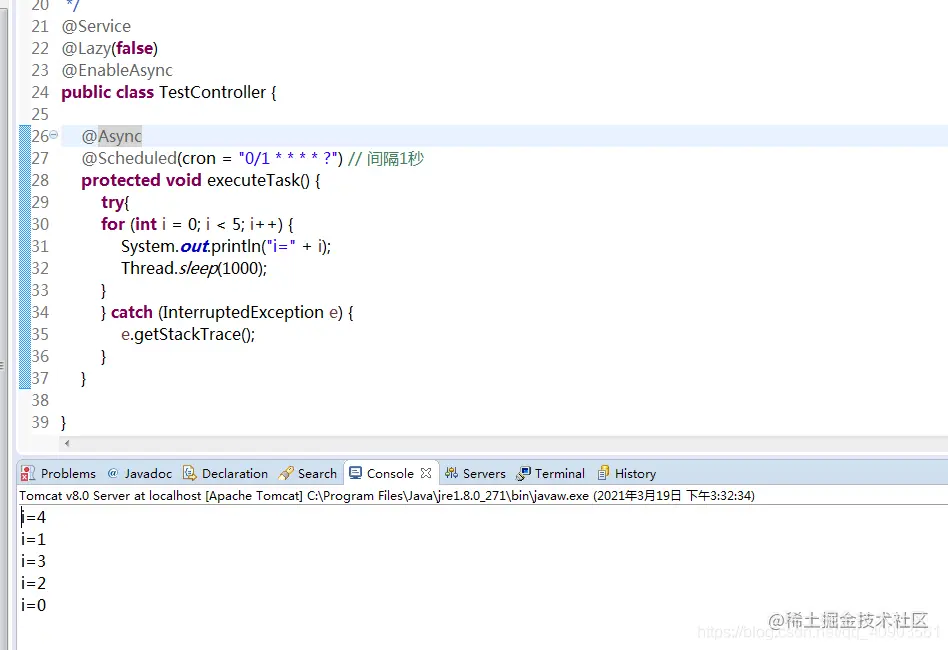 我把代码写成了这样,打印后面加了一个时间,因为我的这个代码是写在项目其中一个class文件的,不单独执行,而是跟随整个工程在tomcat中启动,启动后自动执行。