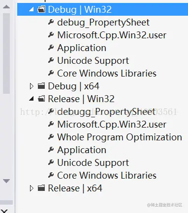 在属性管理器界面又两个文件夹,一个是Debug|win32一个是Release|win32,在里面分别建立一个属性表文件,名字随便