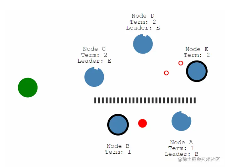 等网络恢复后E节点Termid较大成为Leader节点,并同步节点数据。Leader B降为Follower节点