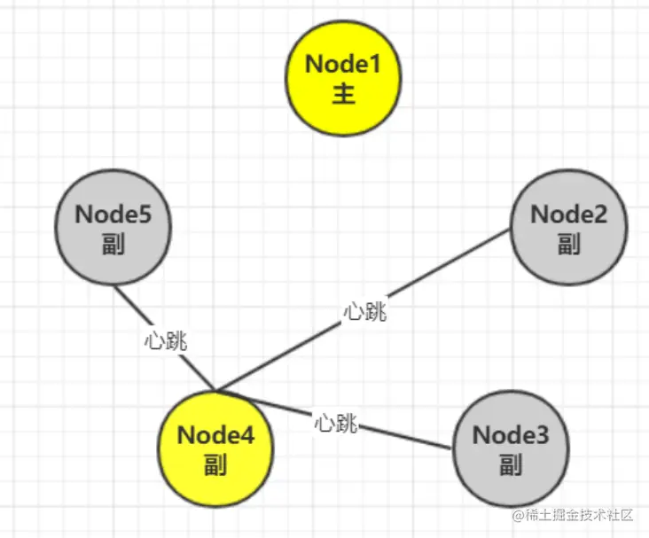 Node1是主节点,剩下4个副本,如果Node1发生网络抖动(Node1本身是正常的,没有宕机),导致从节点无法接收到心跳。他们就会再选出一个主节点。