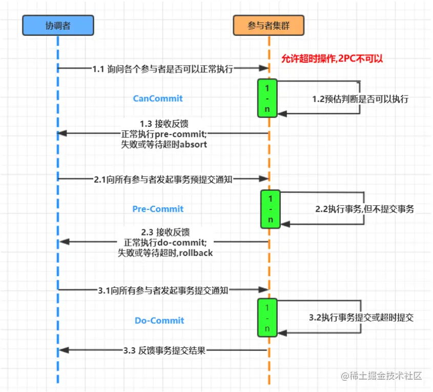 - 3PC对于协调者和参与者都设置了超时机制(在2PC中,只有协调者拥有超时机制,即如果在一定时间内没有收到参与者的消息则默认失败),主要是避免了参与者在长时间无法与协调者节点通讯(协调者挂掉了)的情况下,无法释放资源的问题,因为参与者自身拥有超时机制会在超时后,自动进行本地commit从而进行释放资源。而这种机制也侧面降低了整个事务的阻塞时间和范围。