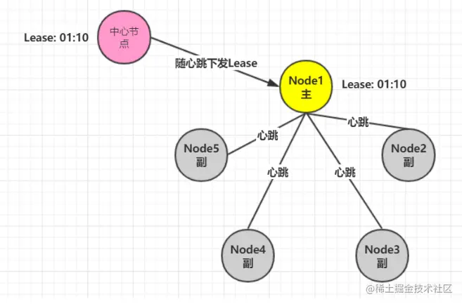 - 引入了一个中心节点,负责下发有时效性的Lease给主节点(这个有效期内不管你出啥问题,我就认你)