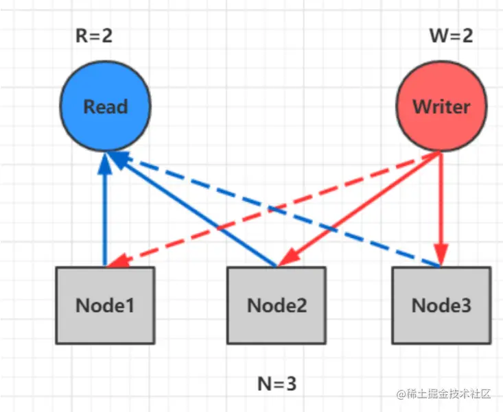 NWR值的不同组合会产生不同的一致性效果,当W+R>N时,整个系统对于客户端来讲能保证强一致性。而W+R<N时无法保证。