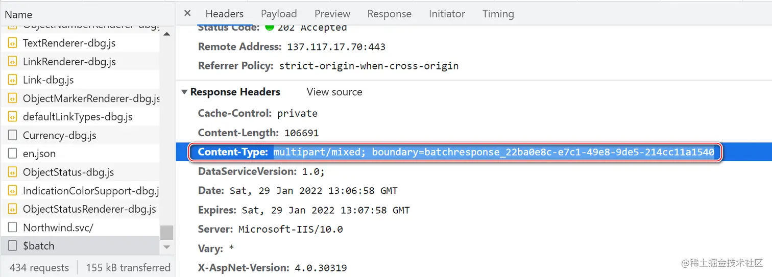正确的 batch response,Content-Type 值应该是 multipart/mixed; boundary=batchresponse_后面跟一个 guid
