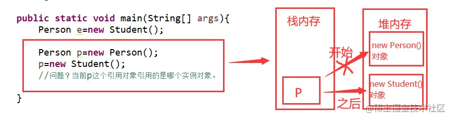 - 第六步将堆内存地址赋值给引用变量,即赋值给P,P存储堆中的地址