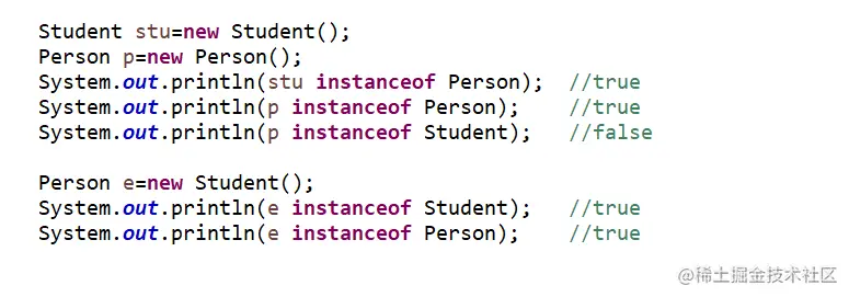 - 举例 :Person p=new Person(); Person e=new Student();//Person类型的变量e,指向Student类型的对象