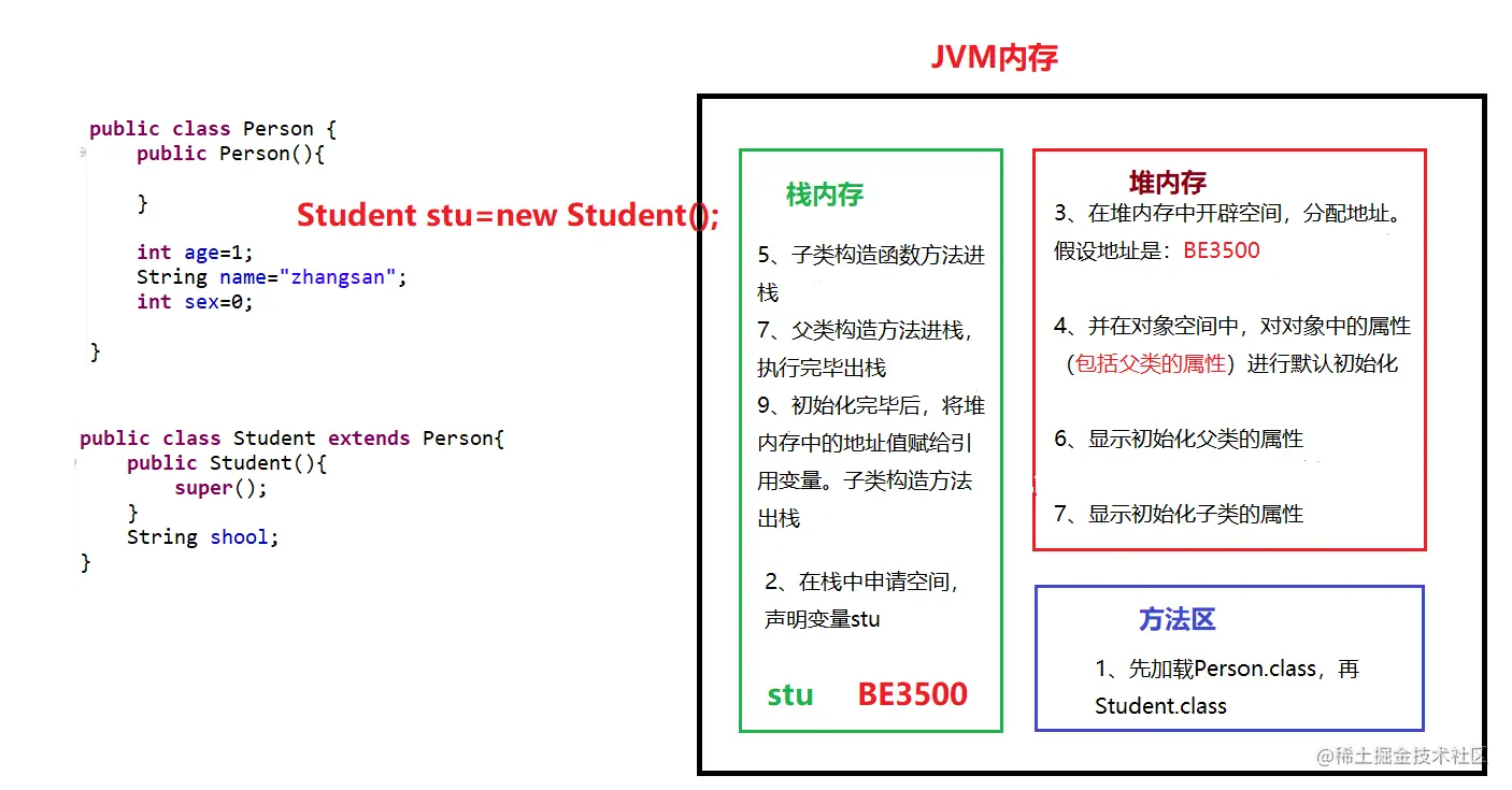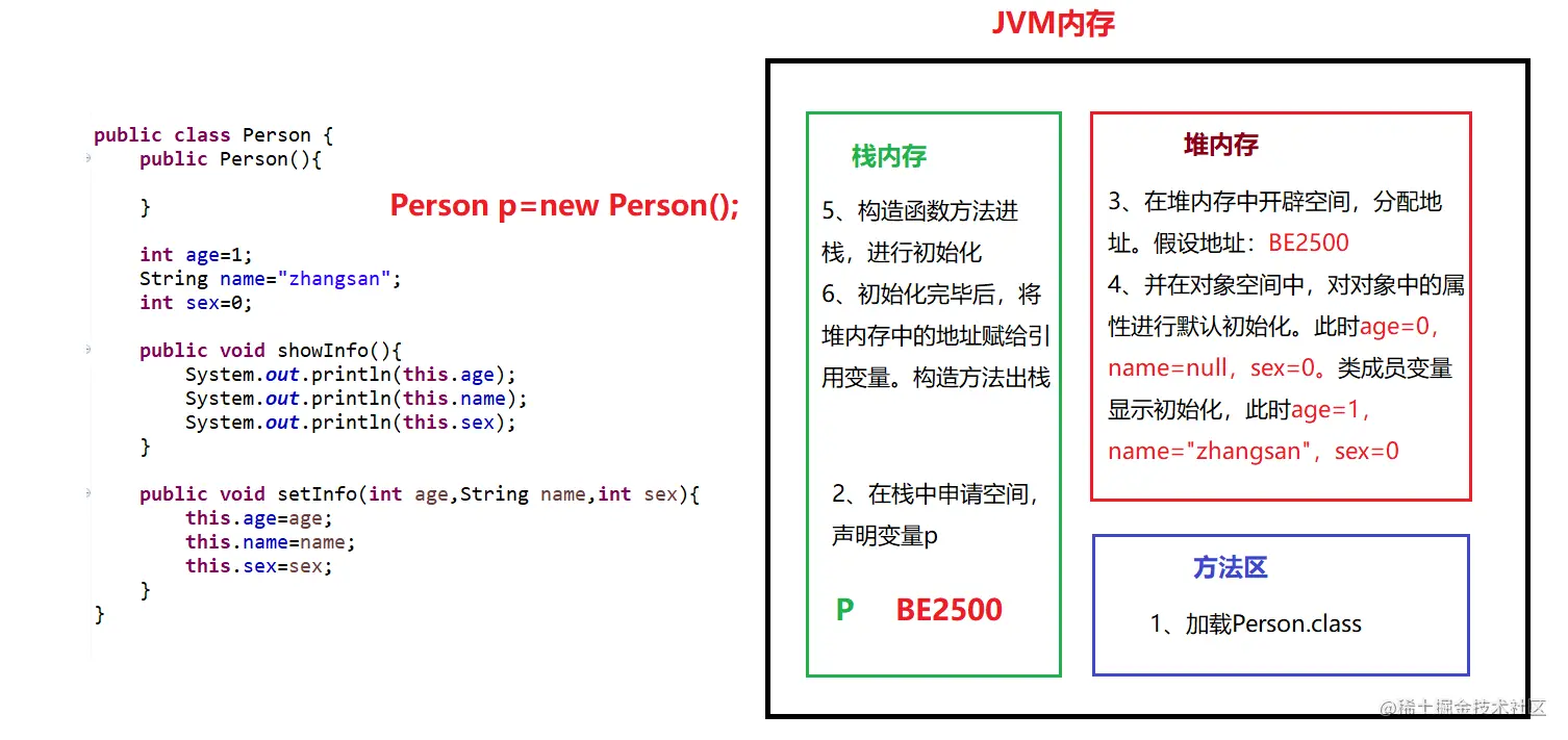 - 第五步构造方法进栈,指的是public Person(){}进栈,初始化指的是执行构造方法的方法体中的代码。