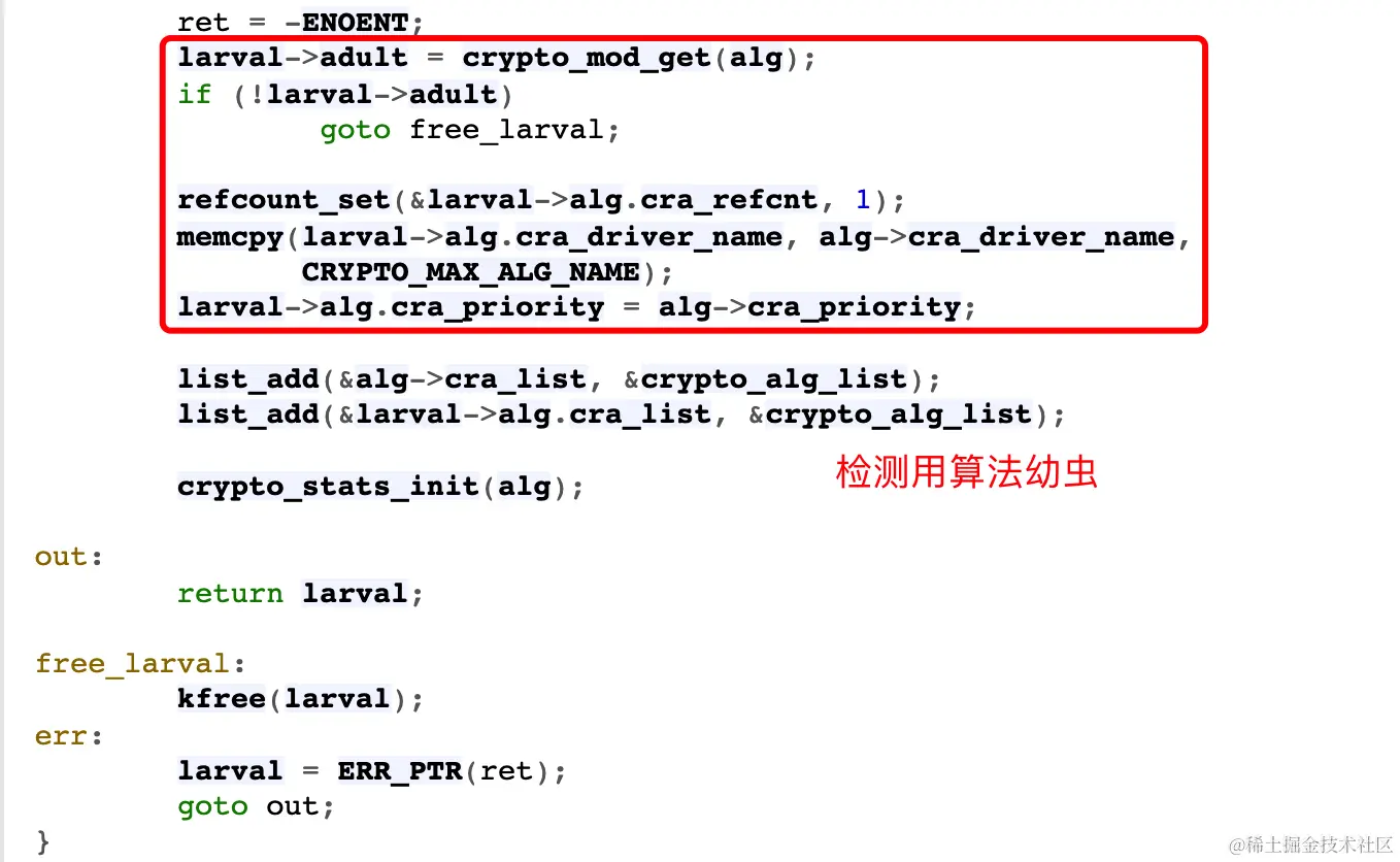 - 算法幼虫larval和算法alg在数据结构上的共同点为通用算法说明,因此crypto_larval_add函数的返回值是通用算法说明,而调用者通过算法类型判断某个通用算法说明是否对应一个算法幼虫,由内联函数crypto_is_larval函数实现