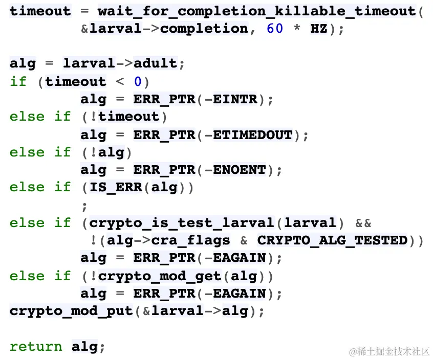 - crypto_larval_wait函数只是简单地等待算法检测完成,而算法检测结果还需要通过其他条件进行综合判断,包括完成量返回的剩余时间timeout、算法幼虫关联的算法成虫alg(=larval->adult)