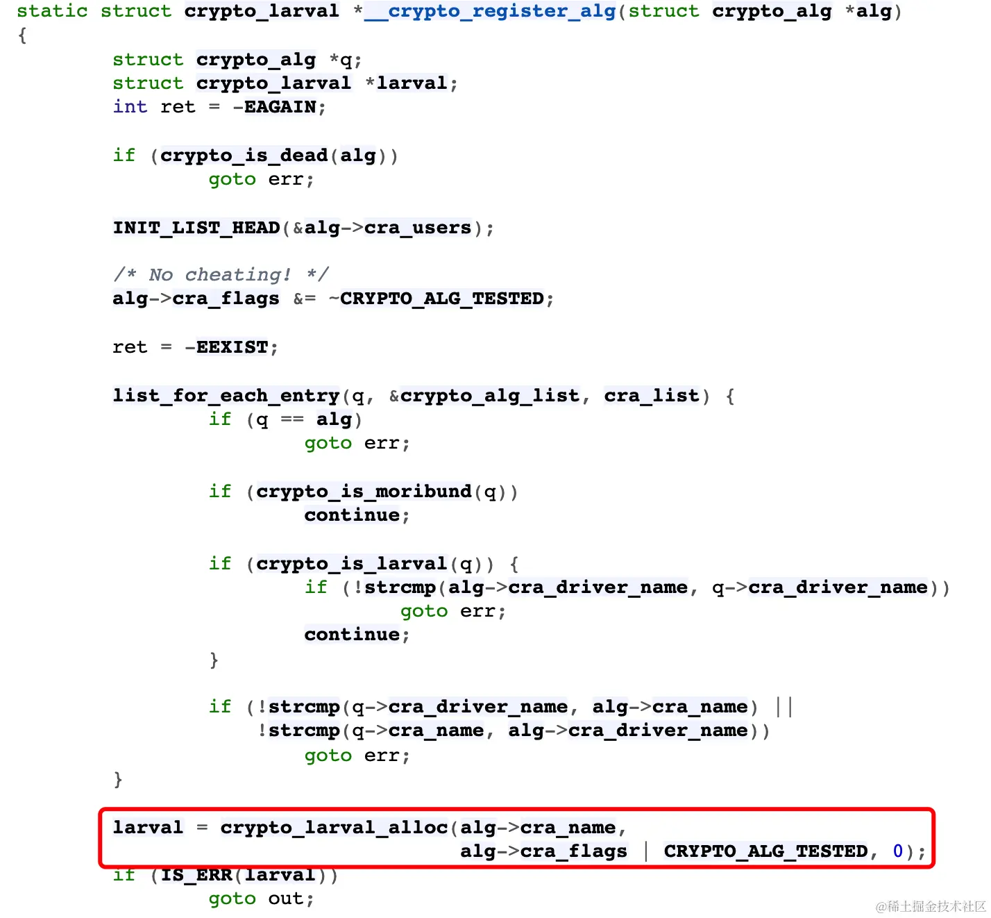 - 如上所示,crypto_larval_add函数并不是简单调用crypto_larval_alloc函数创建注册用算法幼虫larval,在返回前要调用__crypto_alg_lookup函数再次查找是否有符合条件的算法alg,根据查找结果确认返回值。