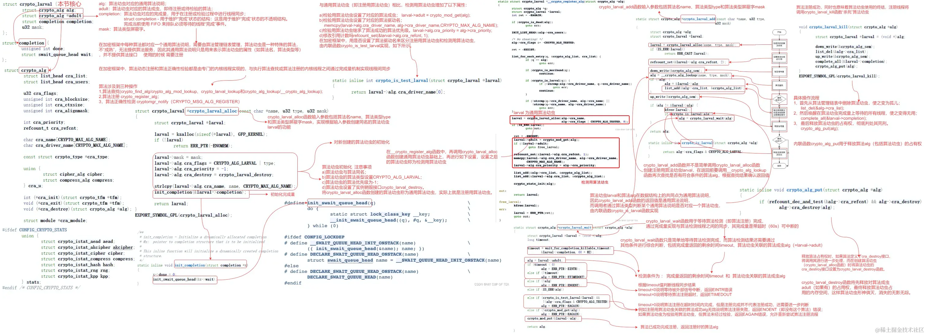 - completion:算法幼虫对应的完成量,用于在注册或检验过程中进行线程同步;struct completion - 用于维护“完成”状态的结构:这是用于维护“完成”状态的不透明结构。完成当前使用 FIFO 来排队必须等待的线程“完成”事件。