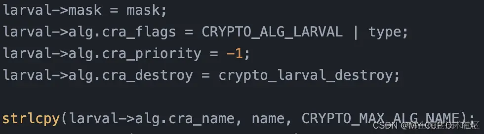 - 在crypto_larval_alloc函数中对新创建的算法幼虫的初始化如下所示