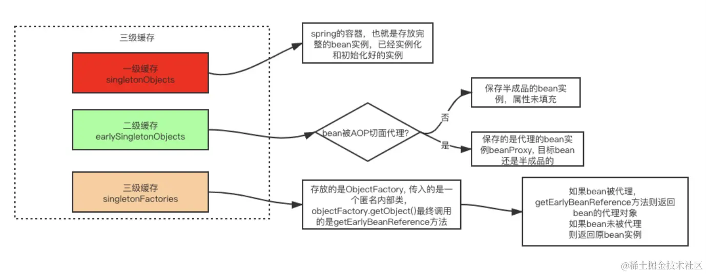 1、实例化beanA 如果有代理 是则调用ObjectFactory.getObject生成代理类 放到二级缓存(如果是只把ObjectFactory放进二级缓存 当获取的时候 再通过ObjectFactory.getObject获取的时候会导致每次都new一个新的对象 代理类也是每次都生成一个新的代理类 和单例不符而且代理类部分会报错 ) 获取属性beanB