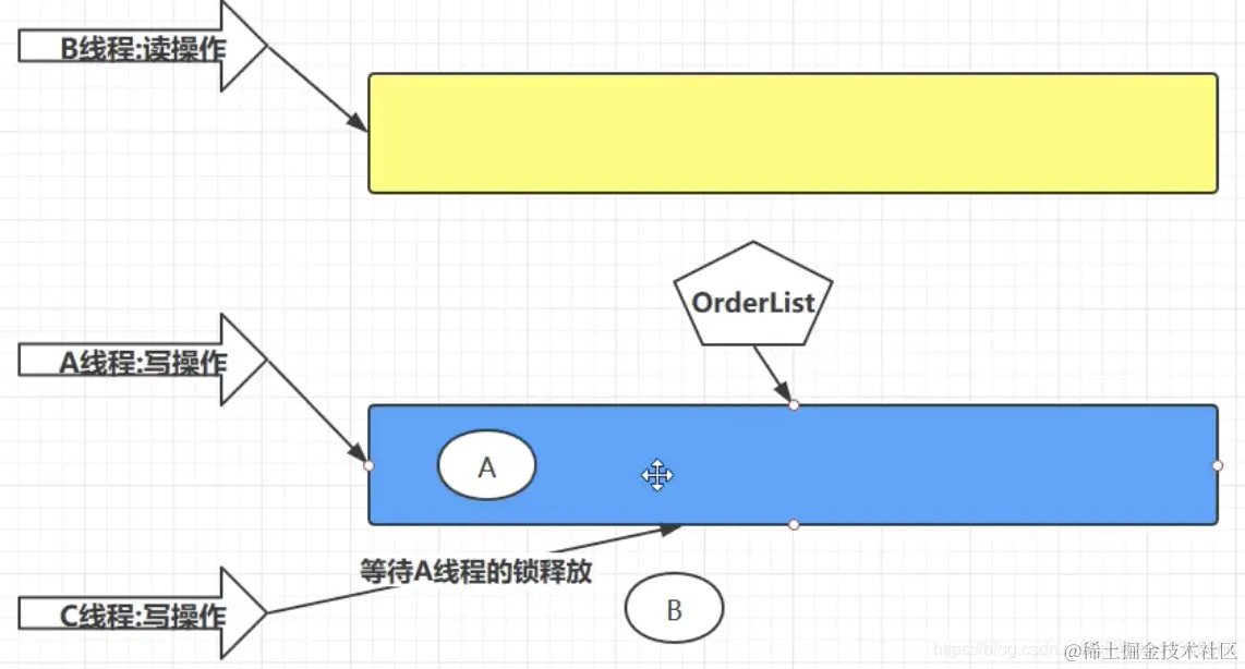 - A线程执行写操作,会基于原本容器的副本(黄色的)进行操作,如果C线程此时也执行写操作,会等待A线程的锁释放,再进行写入操作。B线程执行读操作,直接在原本的容器上面操作即可。等写入完成之后,OrderList会将指针从原本的容器(黄色的)指向容器的副本(蓝色的),而原本的容器(黄色的)会被gcc删除