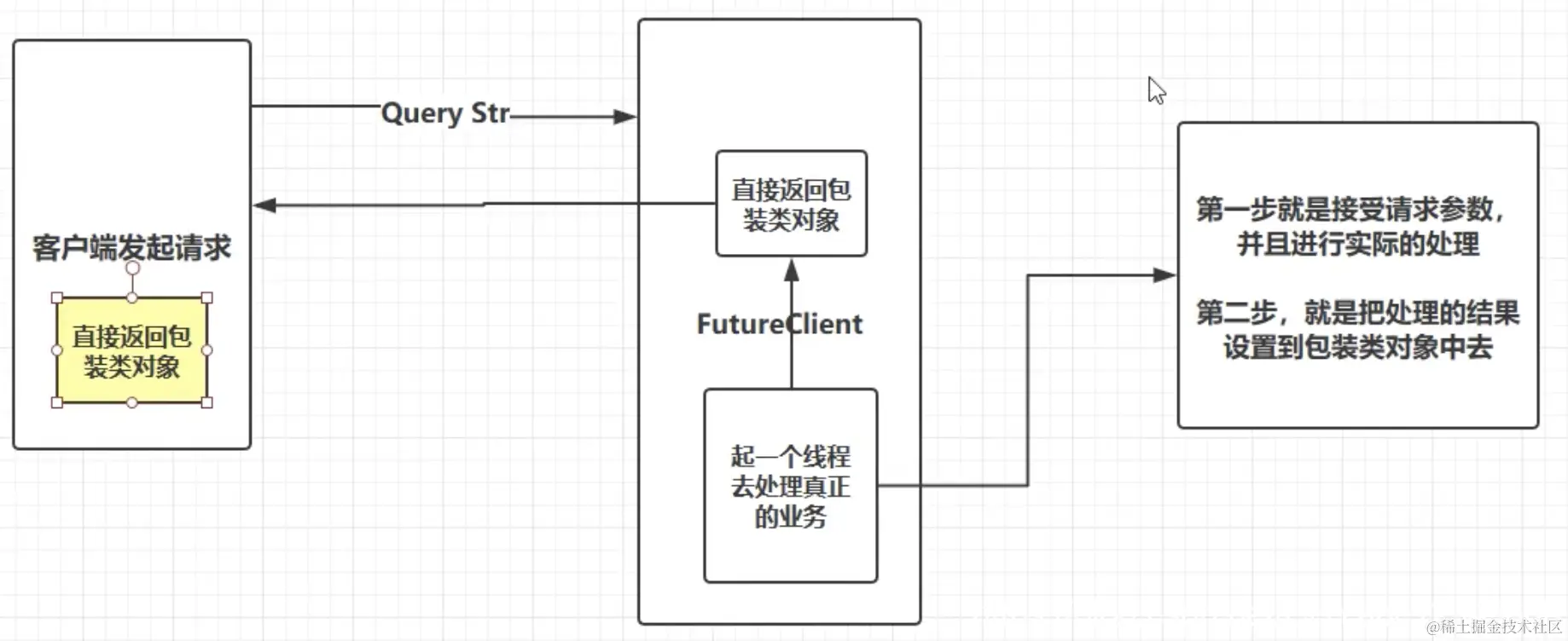 - 当客户端发起请求,返回包装类对象,另外起一个线程去查询数据,再将真实的数据返回