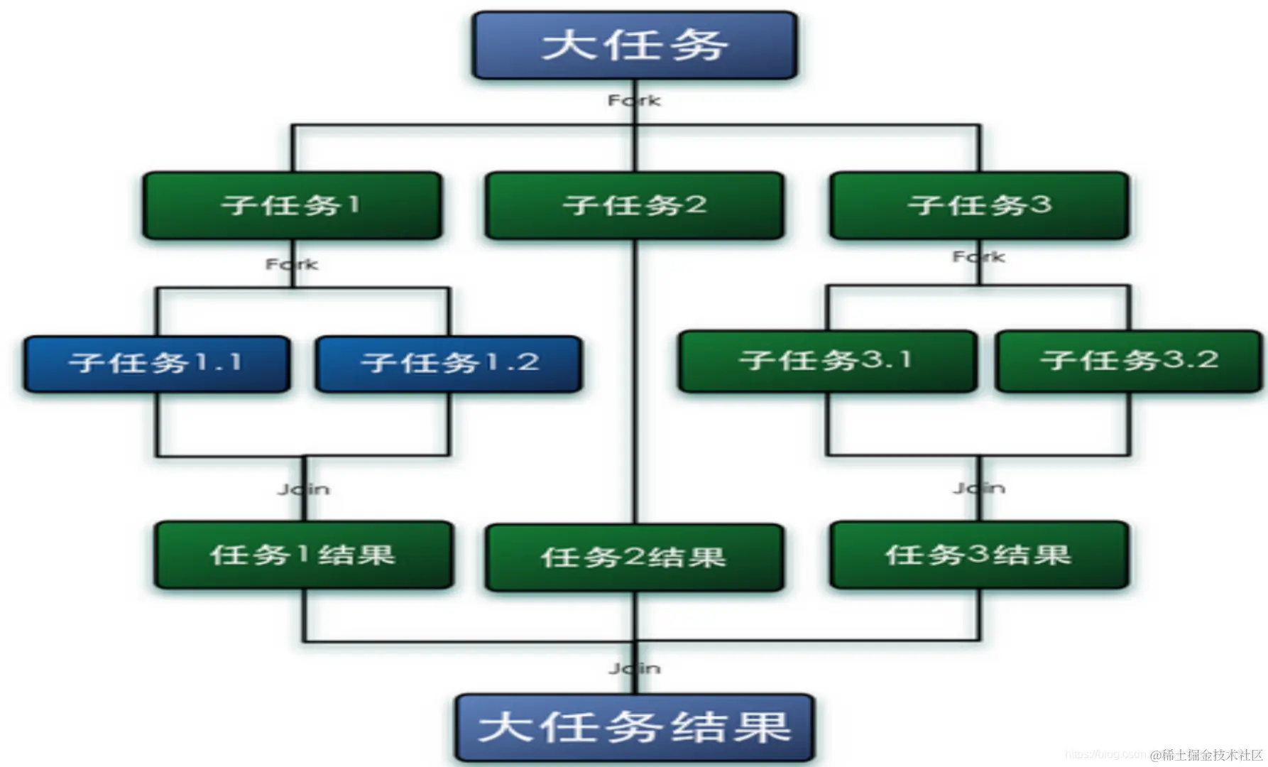 - Fork/Join框架是JAVA7提供的一个用于并行执行任务的框架,是一个把大任务分割成若干个小任务,最终汇总每个小任务结果后得到大任务结果的框架