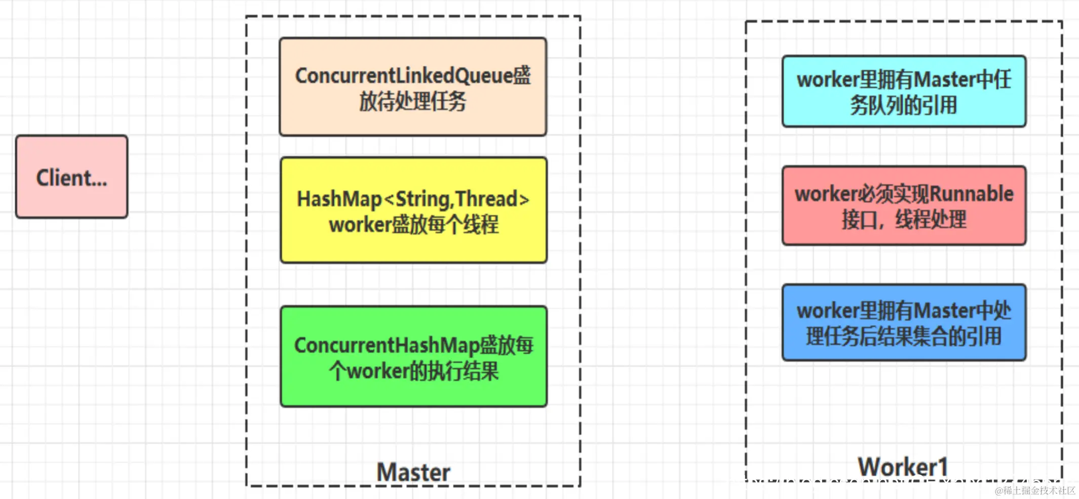 - worker需要对任务队列和线程处理进行映射,并且实现Runnable接口,设立一个集合,存放任务处理完的结果,等处理完之后,将结果集合返还到master的ConcurrentHashMap中,再由Master将结果返回到客户端