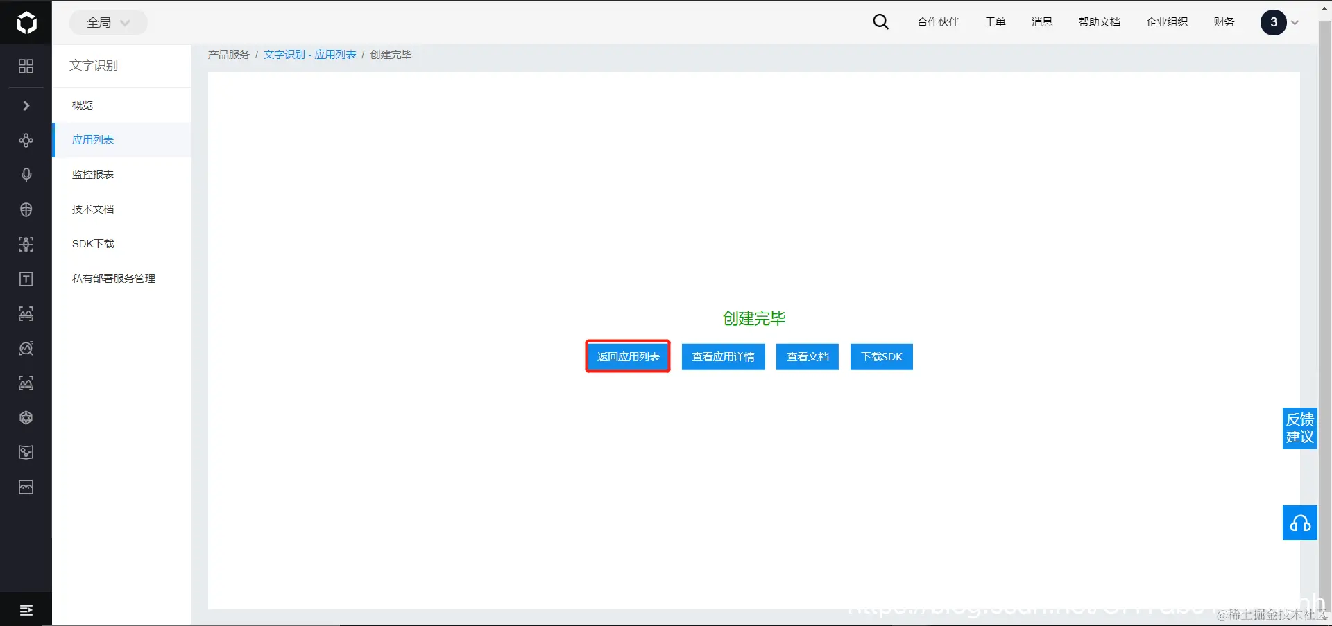 - 创建完成之后,返回到应用列表