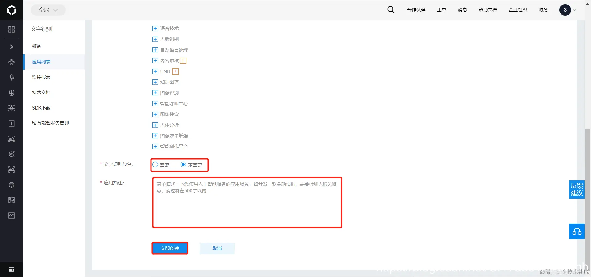 - 输入应用的描述,文字识别的报名选择不需要,然后点击立即创建