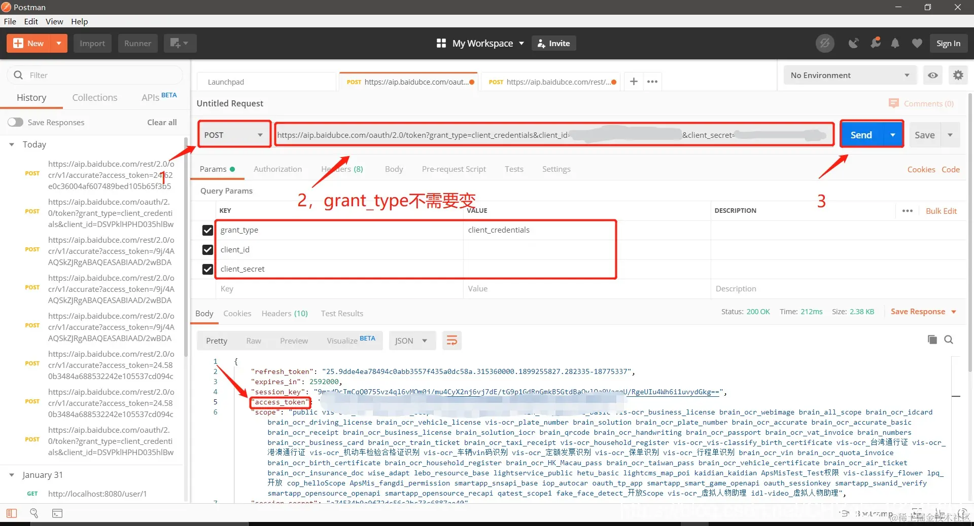- 在grant_type后面输入client_credentials,这个参数不需要变动