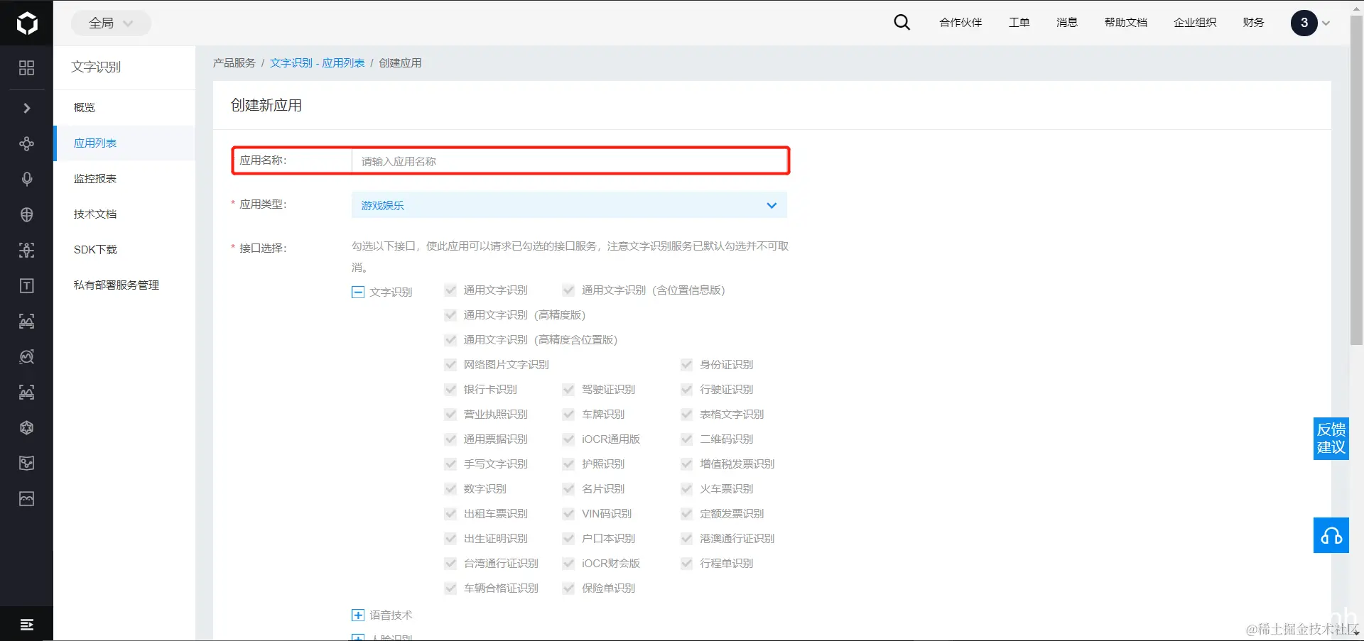 - 找到创建应用的选项,进行ocr项目的创建