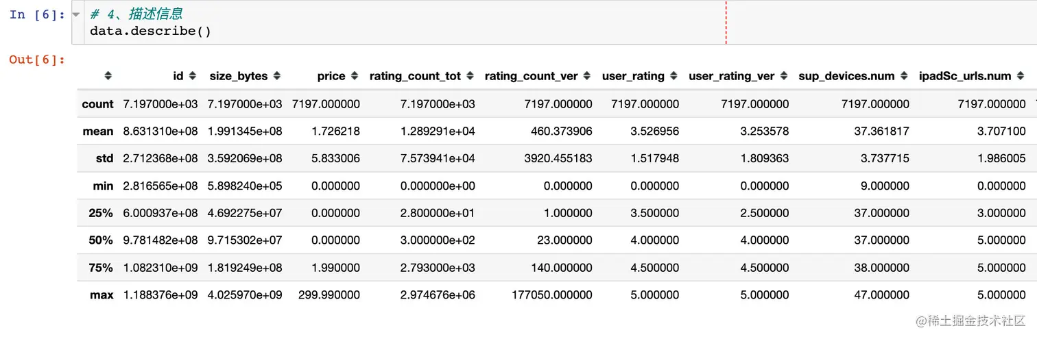 一般情况下,也会查看数据的描述统计信息(针对数值型的字段):